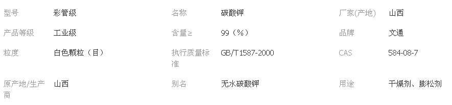 碳酸鉀,白色結(jié)晶粉末。密度2.428g/cm3。熔點(diǎn)891℃,溶于水,碳酸鉀水溶液呈堿性吸濕性強(qiáng)